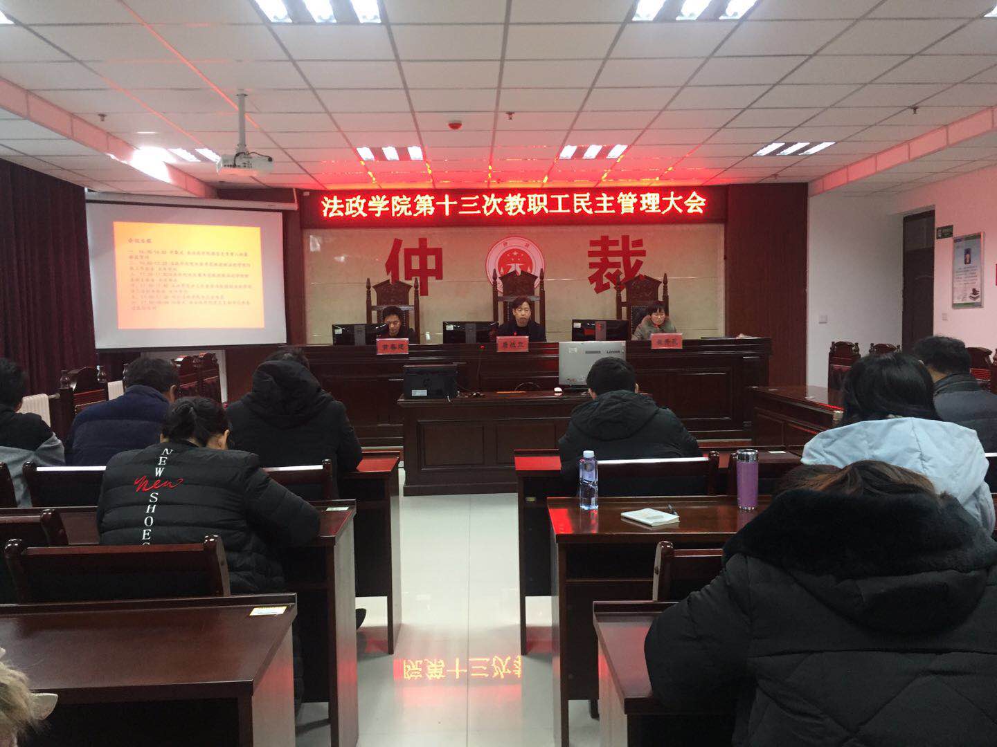 2018年12月28日下午,法政学院第十三次教职工民主管理大会在我院模拟仲裁庭召开。法政学院分工会主席、党总支书记唐战立教授、法政学院院长崔秀花教授、党总支副书记黄春建出席大会,法政学院全体教职工参加了此次大会,会议由法政学院分工会主席、党总支书记唐战立主持。