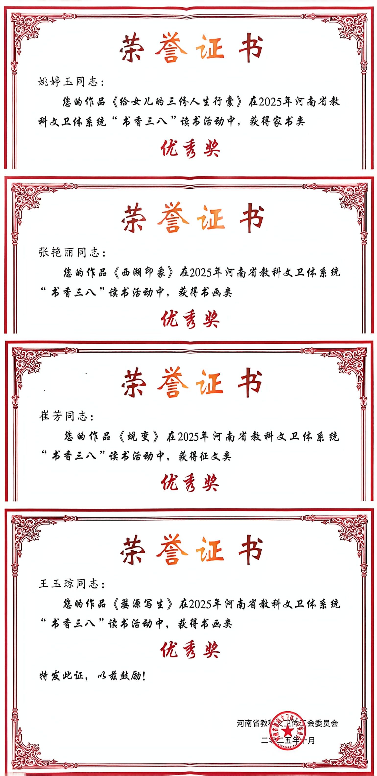 近日,河南省教科文卫体工会印发《关于2025年“书香三八”读书活动获奖情况的通报》(豫教科文卫体工〔2025〕27号),对全省高校获奖作品予以表彰。我校共8件作品获奖,其中一等奖3件、二等奖1件、优秀奖4件。