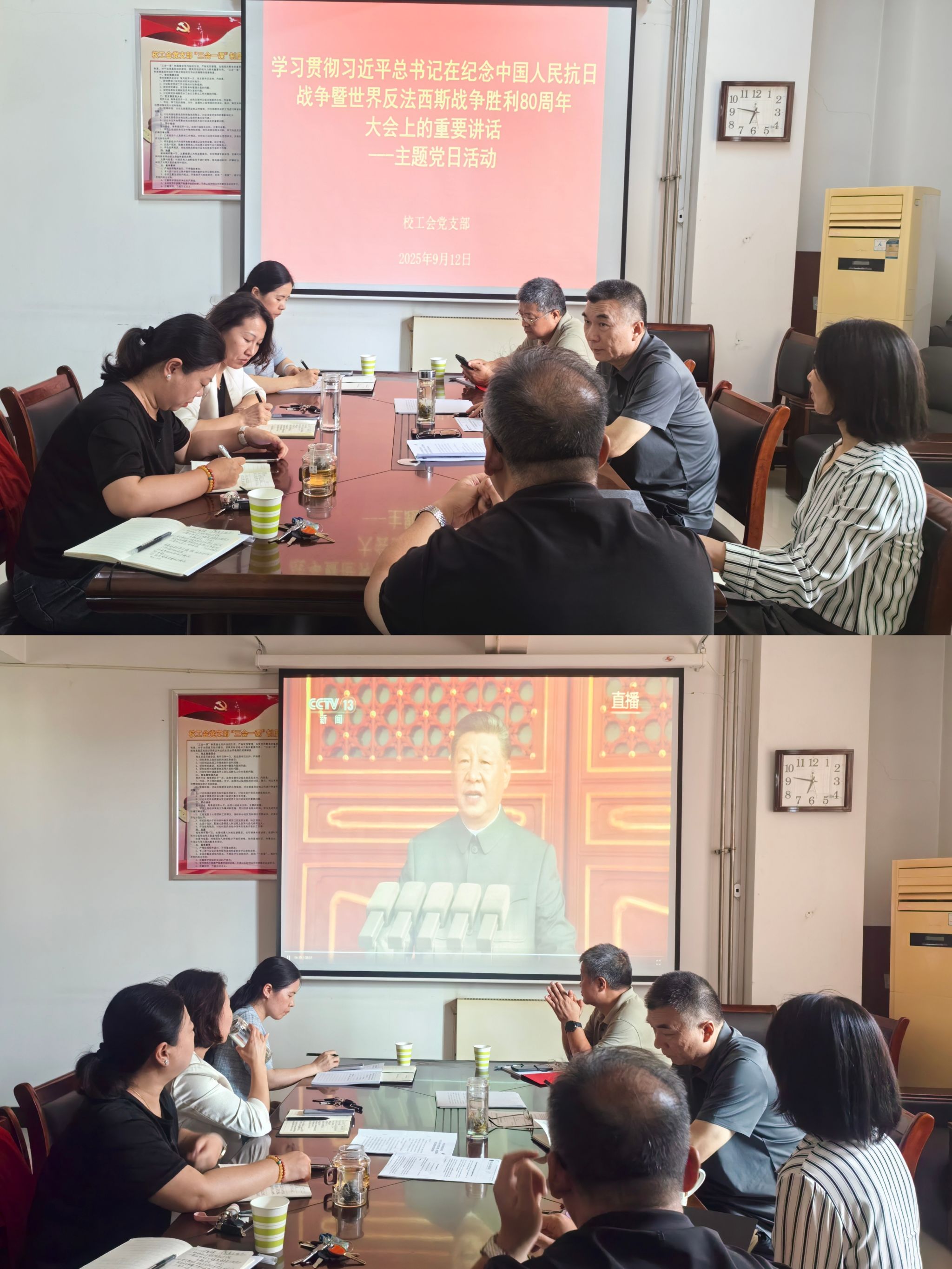 9月12日下午,校工会党支部在行政楼518会议室集中收看习近平总书记在纪念中国人民抗日战争暨世界反法西斯战争胜利80周年大会上的重要讲话。支部书记李万仓主持会议,全体党员参加会议。