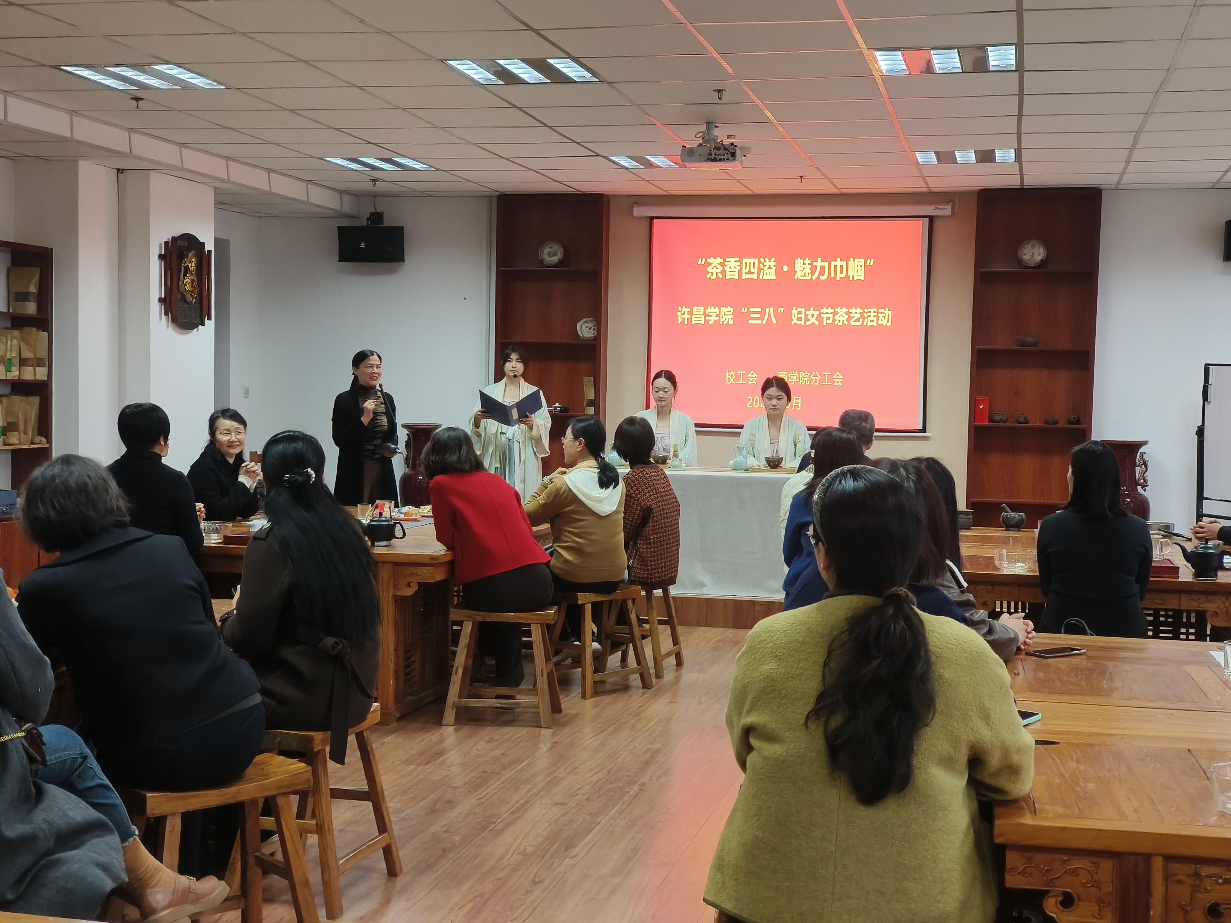 3月14日下午,校工会在商学院文化体验实训室举办了“茶香四溢,魅力巾帼”茶艺活动。来自各分工会的女教职工代表齐聚一堂,共赴一场茶文化的雅集。刘春丽老师通过茶叶品学讲解、仿宋点茶展演、盖碗茶艺体验等环节,让女同胞们在茶香中放松身心,感受传统茶文化魅力。