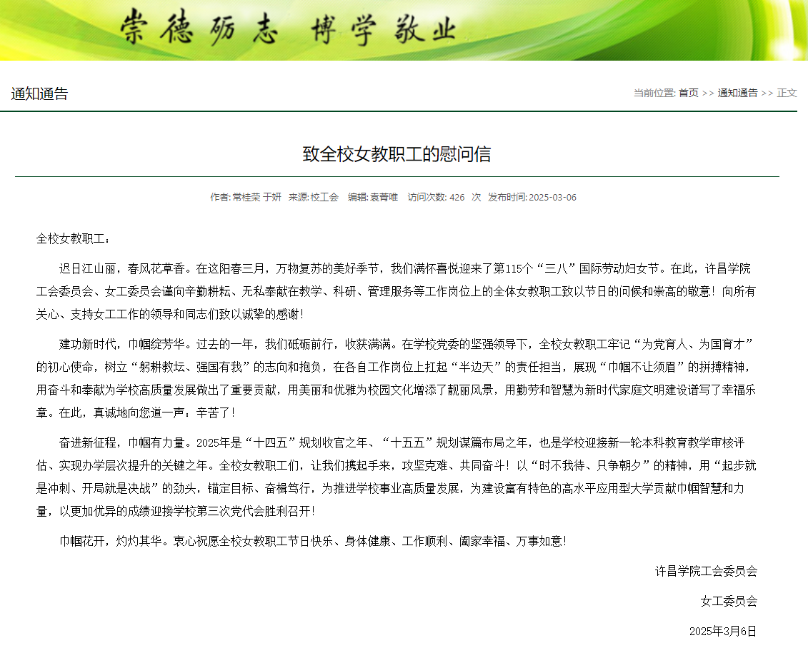 3月8日,校工会、女工委发出慰问信,向全校女教职工致以最崇高的敬意和节日的问候。信中充分肯定了广大女教职工在教学、科研、管理岗位上做出的重要贡献,并号召大家继续发扬自强不息、拼搏进取的精神,为学校高质量发展贡献巾帼智慧和力量。
