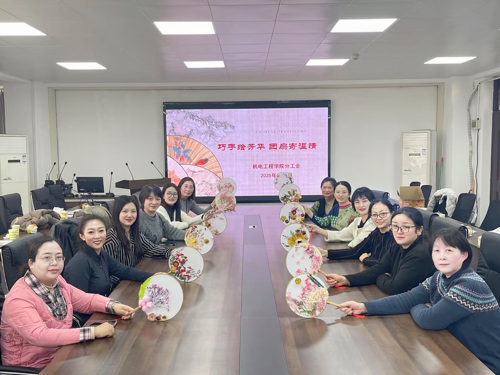 机电工程学院分工会组织召开女教职工座谈会,围绕学校事业发展以及女工工作等议题畅所欲言。随后,开展了“创意团扇”DIY活动,女教职工们充分发挥想象力,巧手点缀干花打造立体装饰,现场欢声笑语不断。