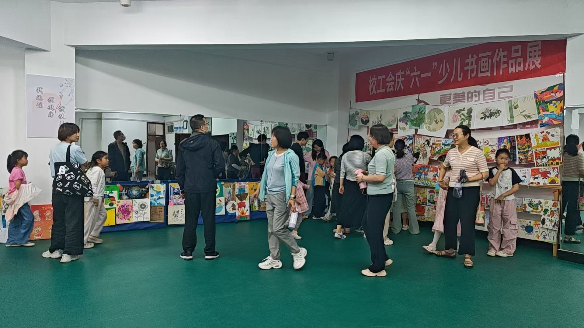 活动现场共展出来自教职工子女的130幅优秀作品,吸引了众多家长与孩子共同参与,孩子们兴奋地向父母和同伴介绍自己的作品,此起彼伏的童声让整个展厅充满活力。书法作品或刚劲有力,或温婉秀丽,尽显孩子们扎实的书法功底;绘画作品色彩斑斓,从梦幻的卡通人物到祖国的自然风光,题材丰富多样,展现了孩子们丰富的想象力和独特的艺术视角,孩子们的作品不仅充满创意,更饱含对党和祖国的深情。