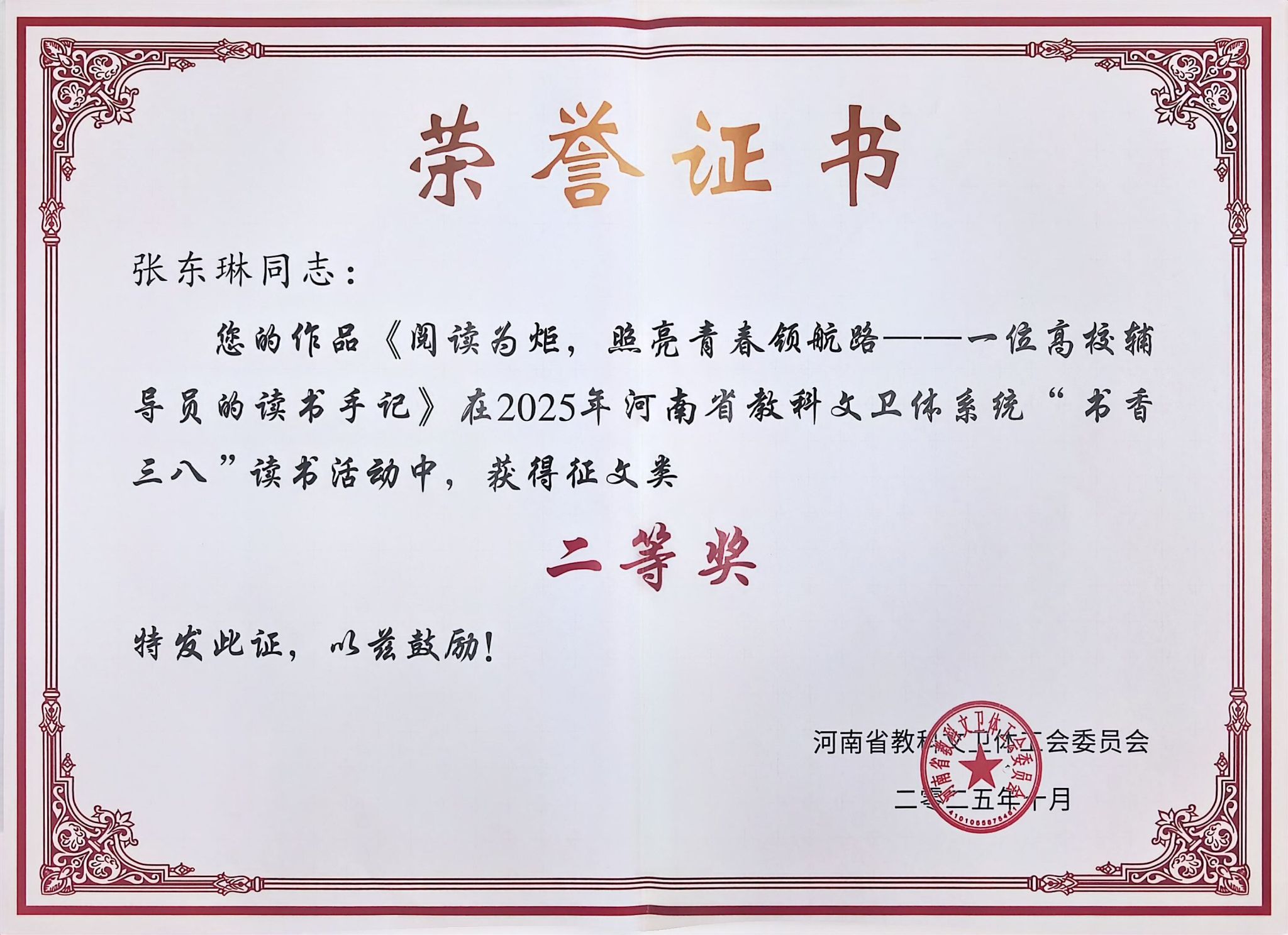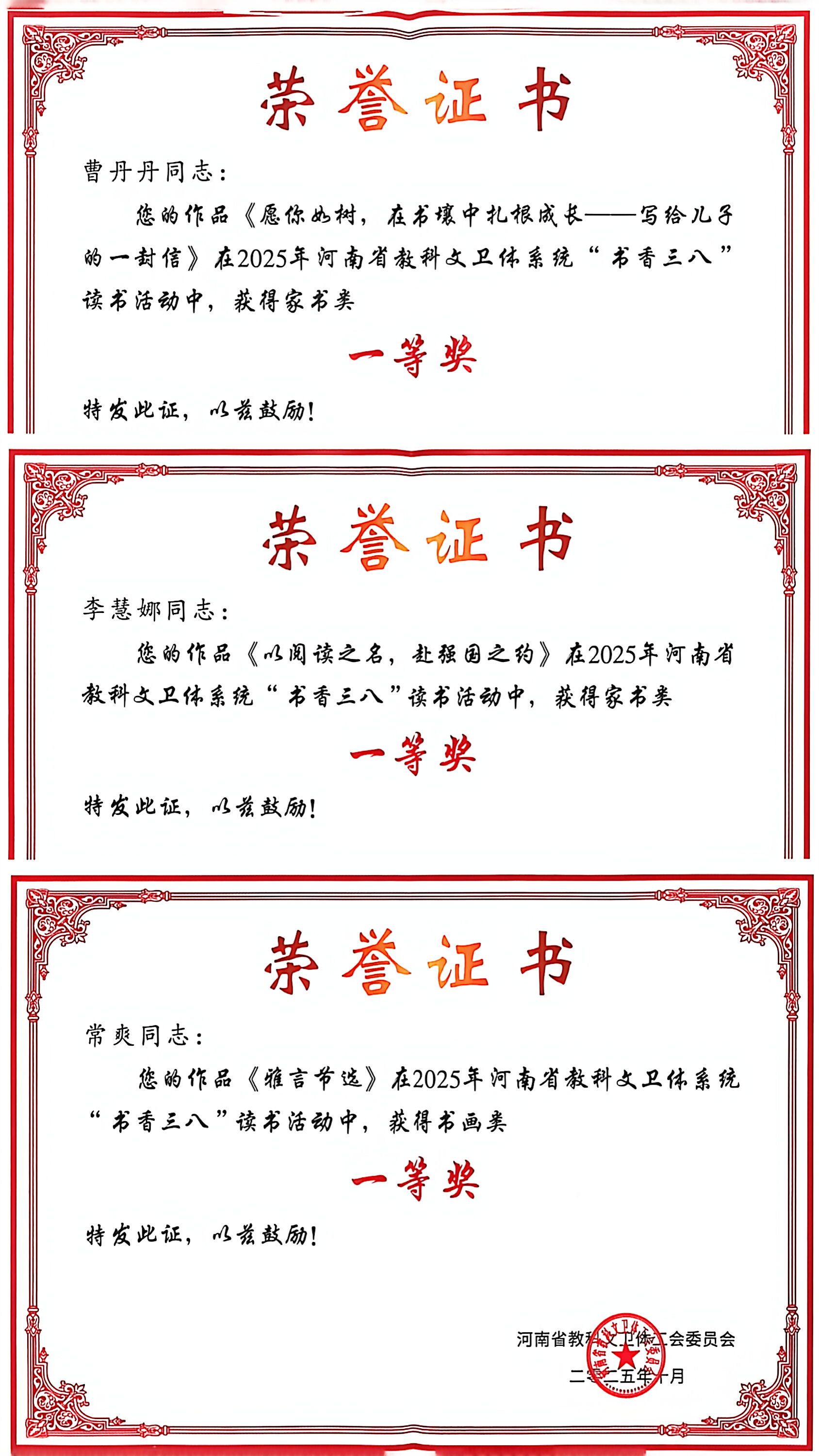 曹丹丹、李慧娜两位老师分别以《愿你如树,在书壤中扎根成长——写给儿子的一封信》《以阅读之名,赴强国之约》荣获家书类一等奖;常爽老师凭《雅言节选》荣获书画类一等奖。张东琳老师凭《阅读为炬,照亮青春领航路——一位高校辅导员的读书手记》荣获征文类二等奖。此外,姚婷玉、张艳丽、崔芳、王玉琼等老师也分别在家书、书画、征文类别中荣获优秀奖。