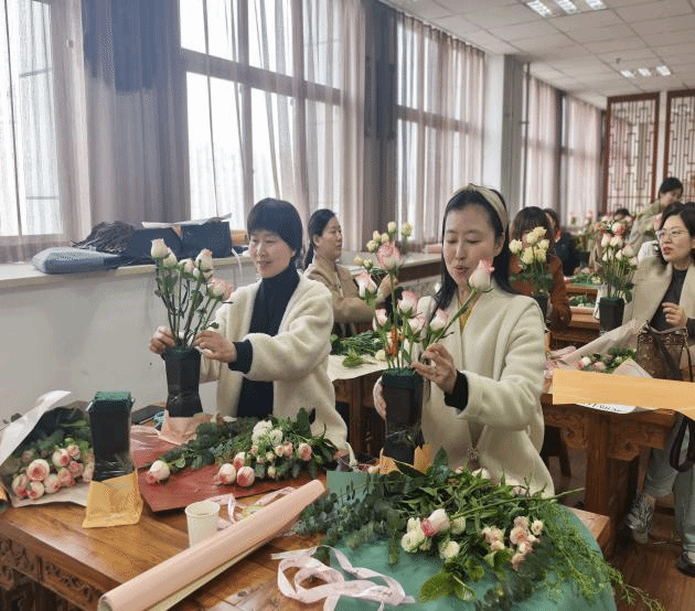 女教职工们兴致盎然、巧手创作,精心修剪、巧妙搭配,将普通花材制作成一束束错落有致、清新雅致的花艺作品,现场花香四溢、氛围温馨,大家在交流互动中切磋技艺、分享喜悦,充分展现了我校女教职工积极向上、知性优雅的精神风貌。